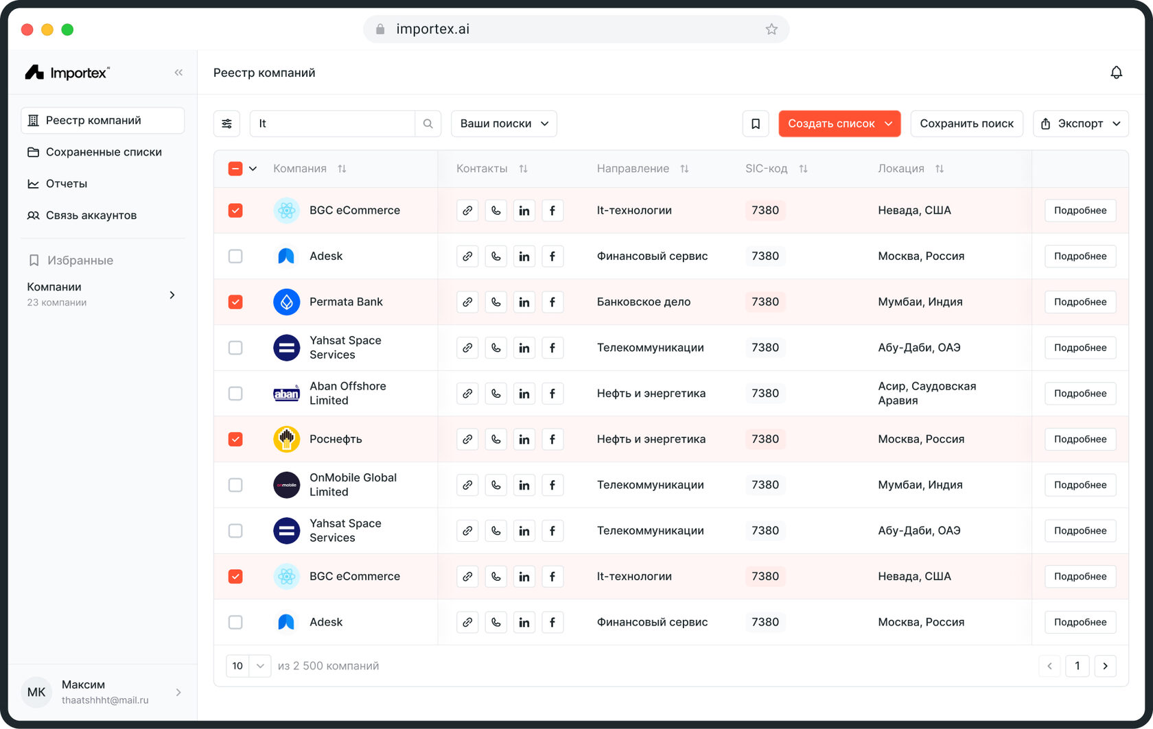 Обширная база проверенных компаний, фильтры по странам и отраслям. Находи клиентов, партнеров и поставщиков.